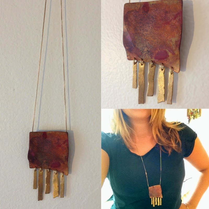My vision for this pendent completely evolved as I started making it. The main piece is made of copper and the jump rings and dangling fringe-like pieces are brass. The chain is just a sweet golden chain I borrowed from my mom and never gave back hehehe (Thanks Mom :-)).